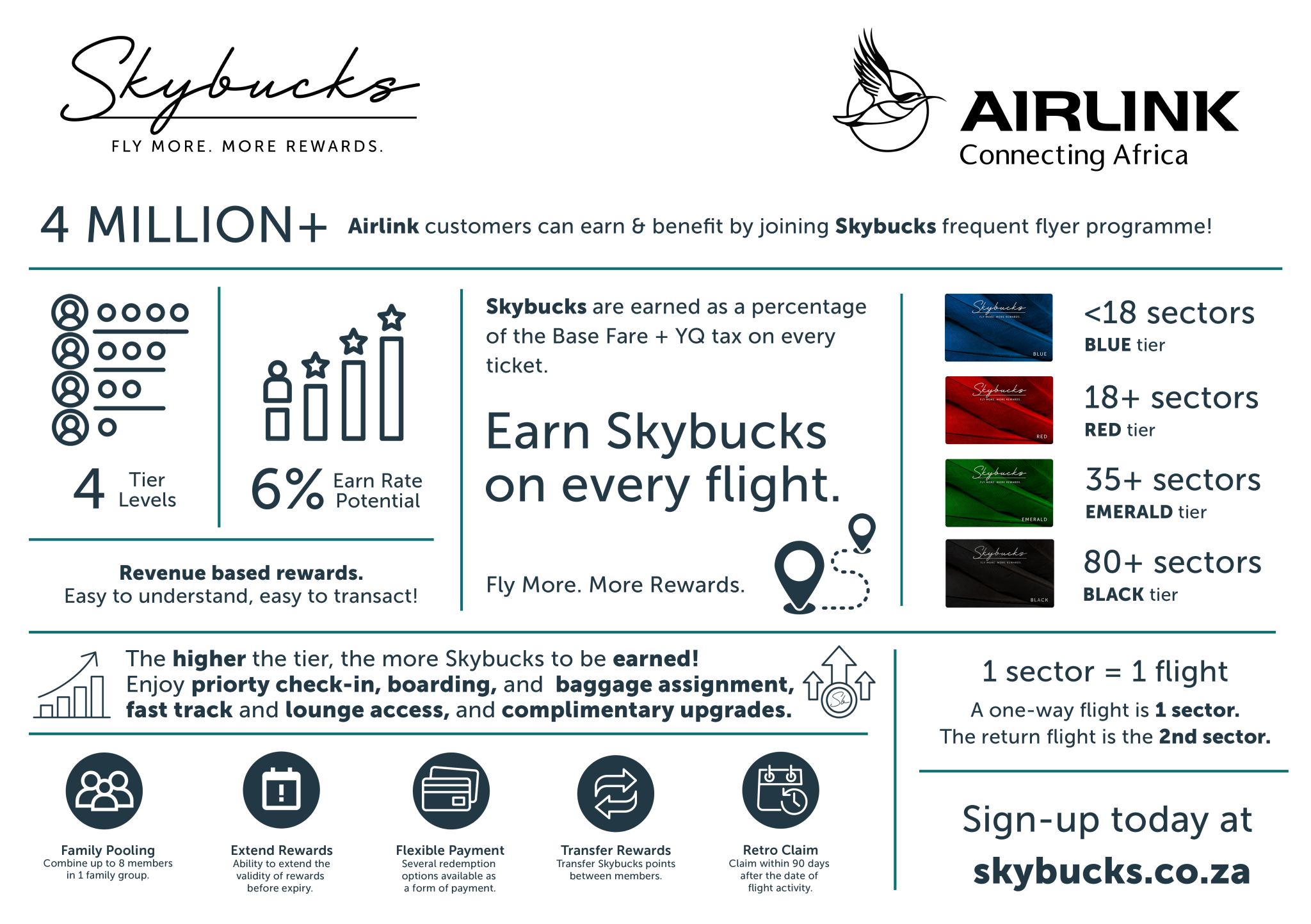 Skybucks, the loyalty programme of Airlink brings you a world of privileges and rewards. You will receive the Skybucks Blue card as the entry level of membership. With regular travel, you can move up to various tiers such as Red and Emerald.